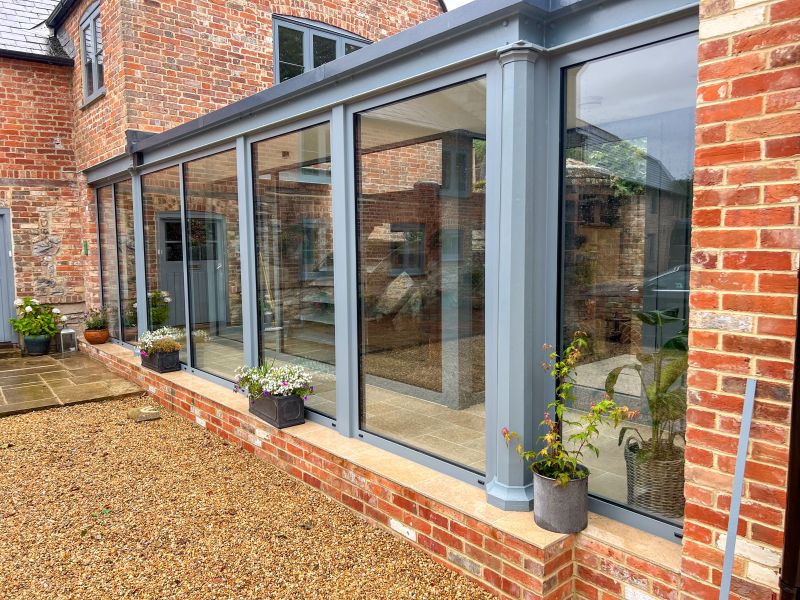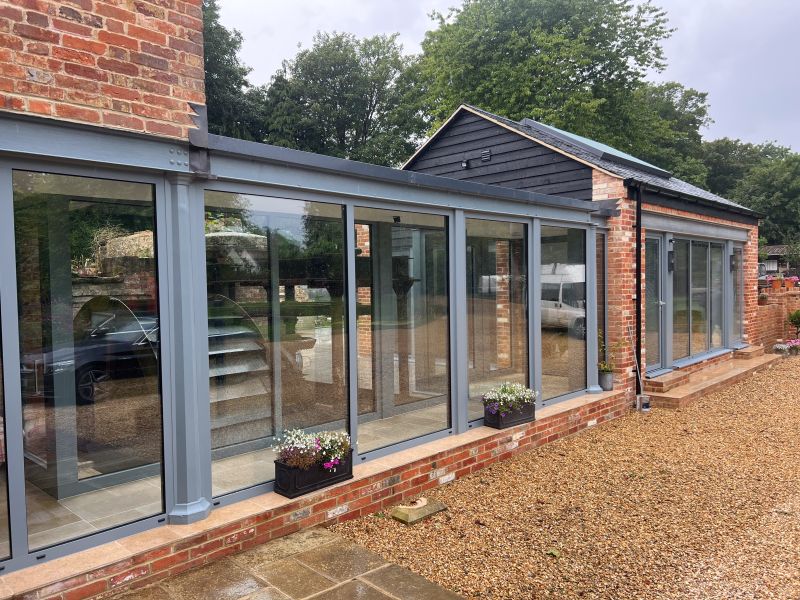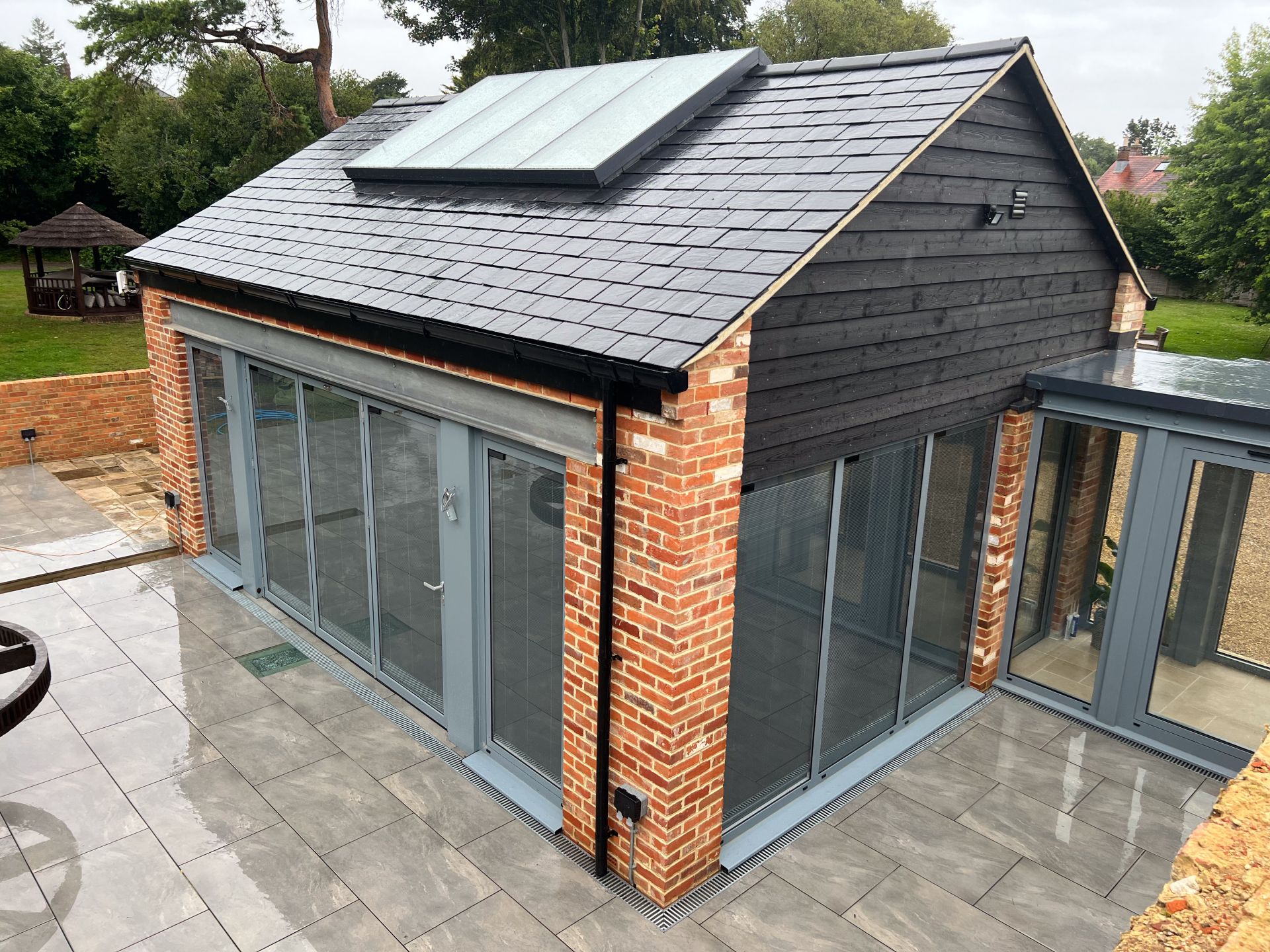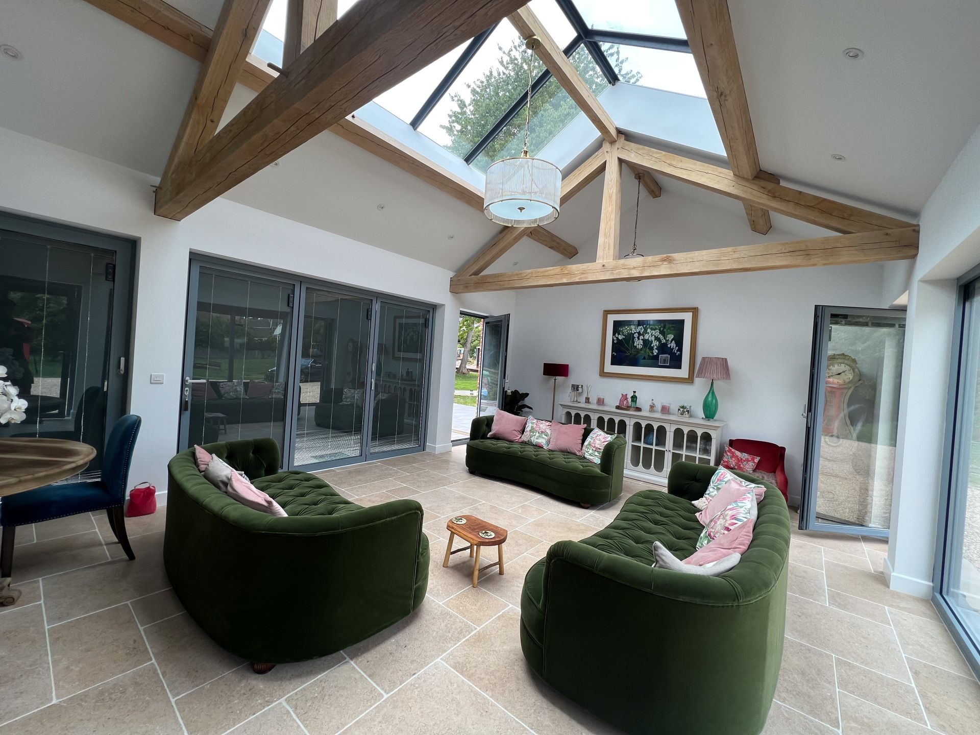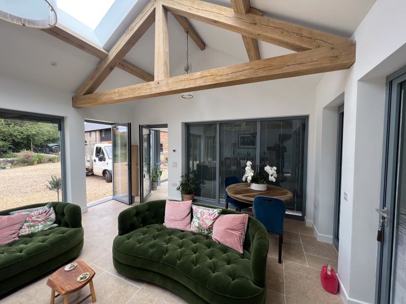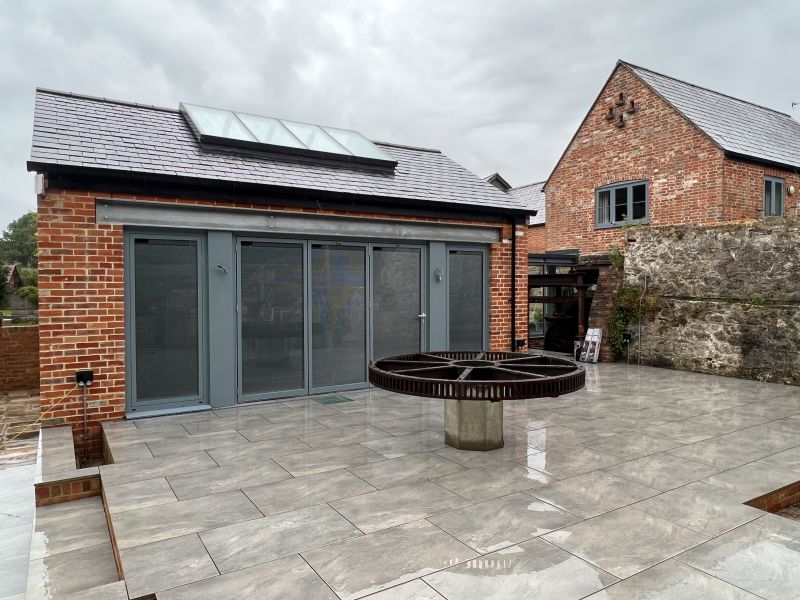 A light-filled extension combining traditional brick and slate with modern aluminium glazing. The oak-trussed garden room features a dramatic glazed ridge, while the bespoke glazed link showcases the property’s original mill machinery. Natural stone floors flow seamlessly between inside and out, creating a timeless connection between heritage and contemporary living.