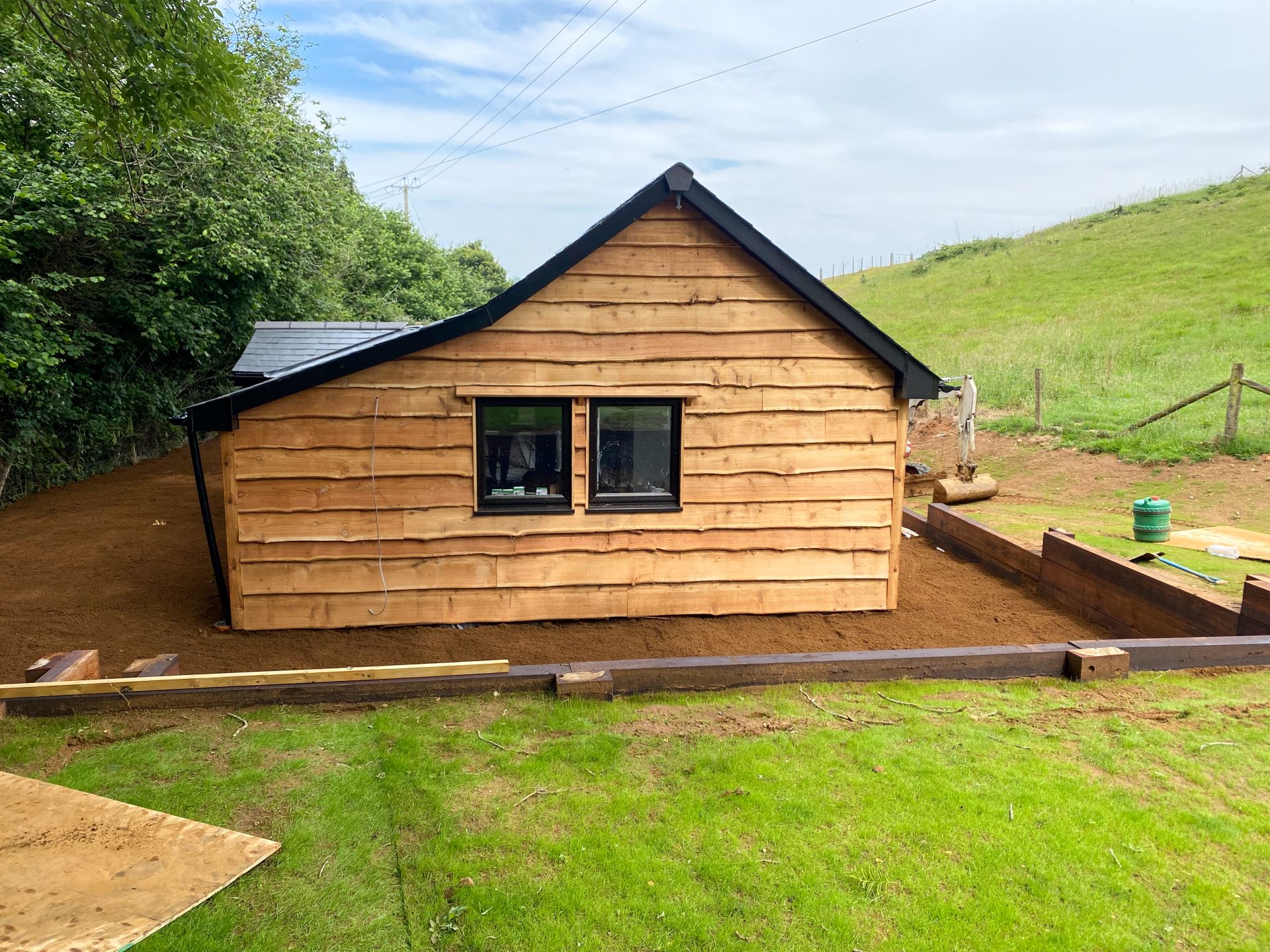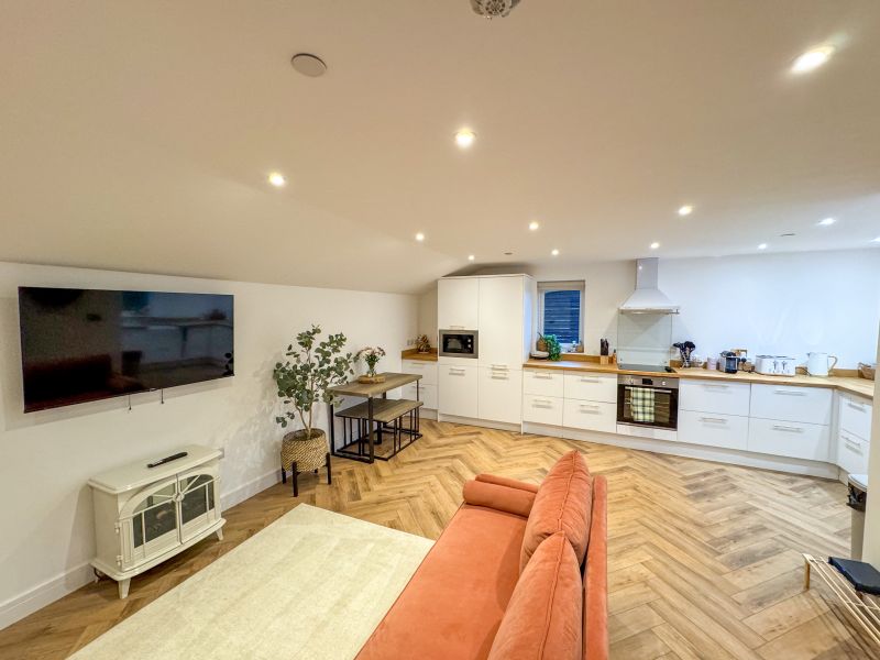 A modern single-storey home built on a robust raft foundation, finished with natural cedar cladding and decking for a warm, timeless exterior. The interior embraces a minimalistic design, featuring herringbone flooring, a sleek open-plan kitchen, and a contemporary bathroom, all showcasing the use of natural materials for a calm and inviting atmosphere.