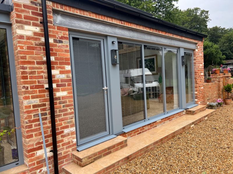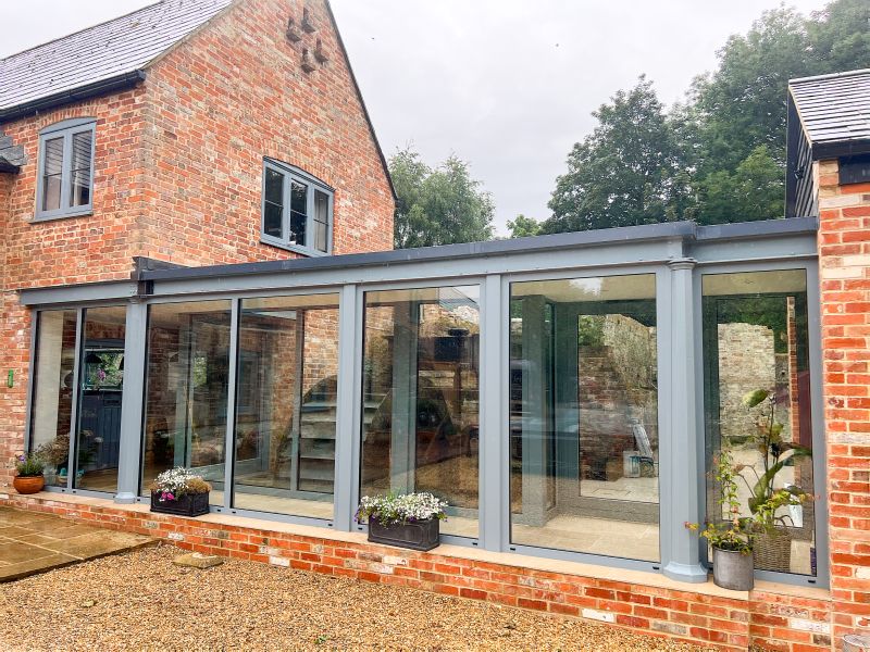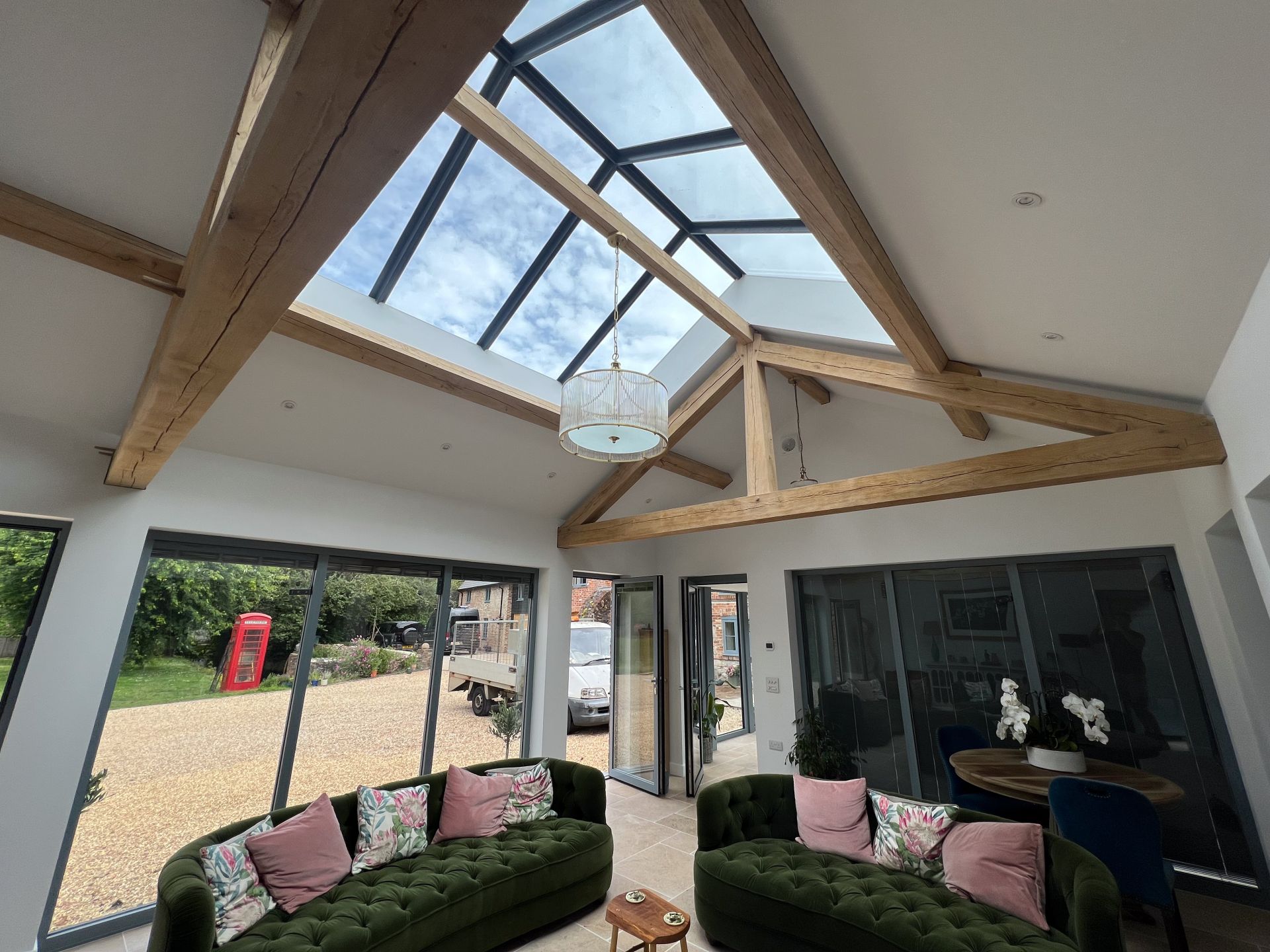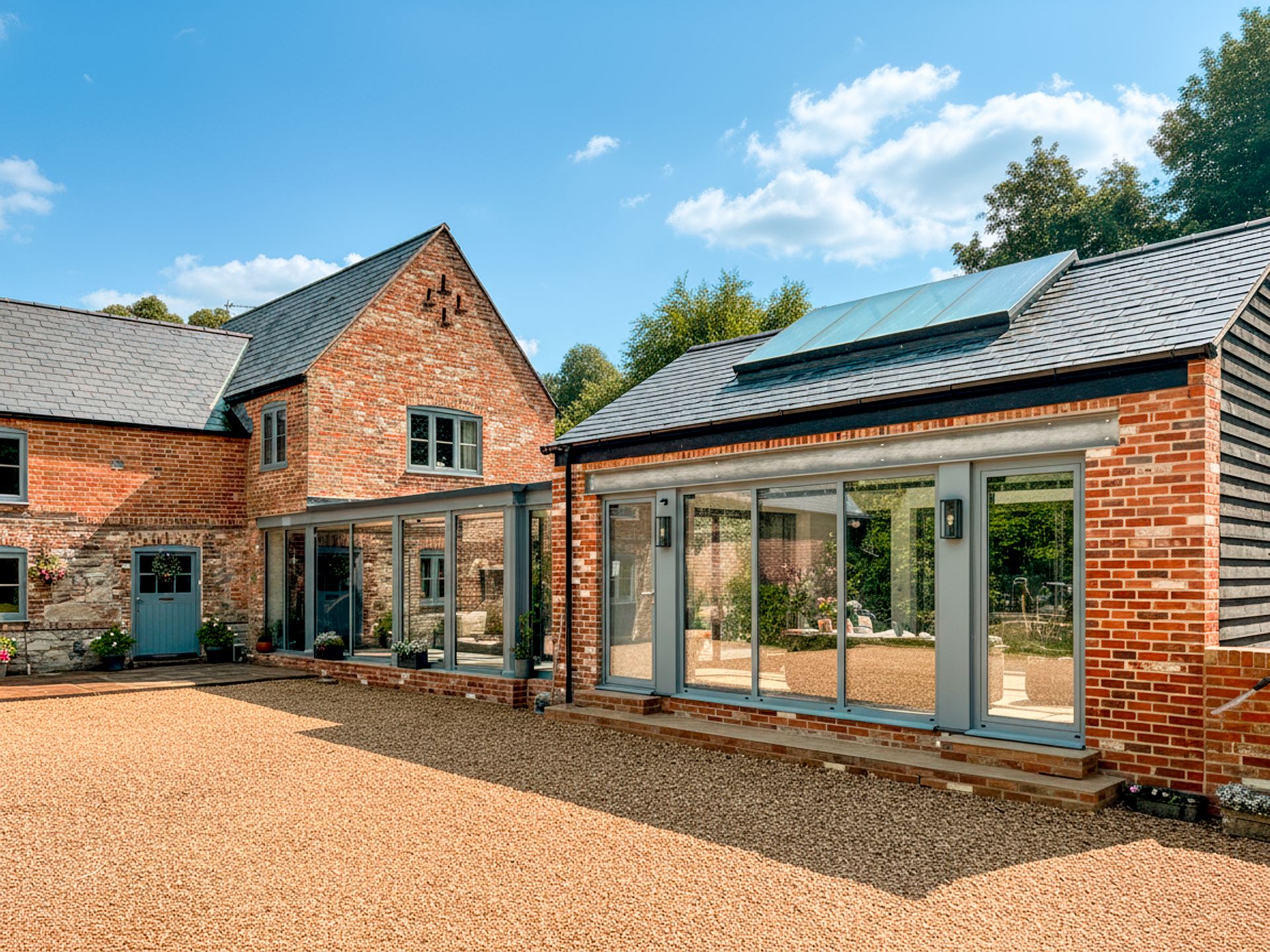 A light-filled extension combining traditional brick and slate with modern aluminium glazing. The oak-trussed garden room features a dramatic glazed ridge, while the bespoke glazed link showcases the property’s original mill machinery. Natural stone floors flow seamlessly between inside and out, creating a timeless connection between heritage and contemporary living.