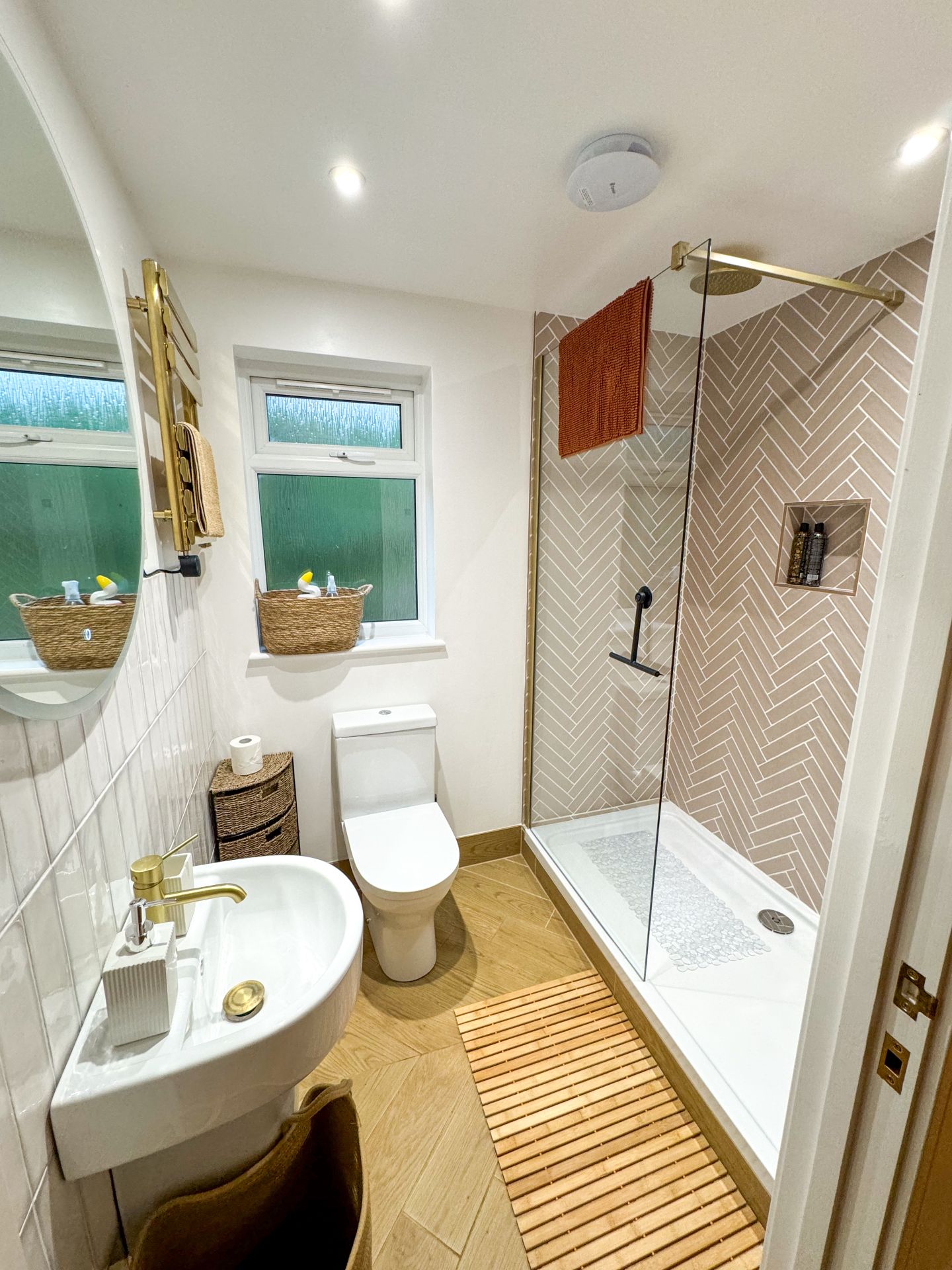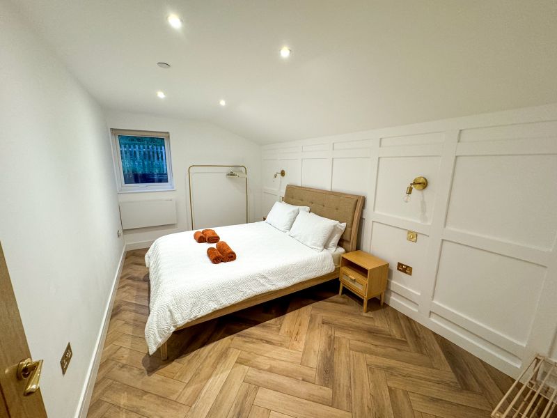 A modern single-storey home built on a robust raft foundation, finished with natural cedar cladding and decking for a warm, timeless exterior. The interior embraces a minimalistic design, featuring herringbone flooring, a sleek open-plan kitchen, and a contemporary bathroom, all showcasing the use of natural materials for a calm and inviting atmosphere.